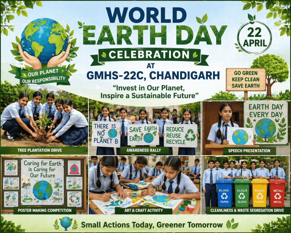 World Earth Day was celebrated with great enthusiasm at GMHS-22C, Chandigarh. Students actively participated in various activities to spread awareness about protecting our environment. They created beautiful posters highlighting the importance of saving the Earth, took part in rallies, and planted saplings within the school premises.